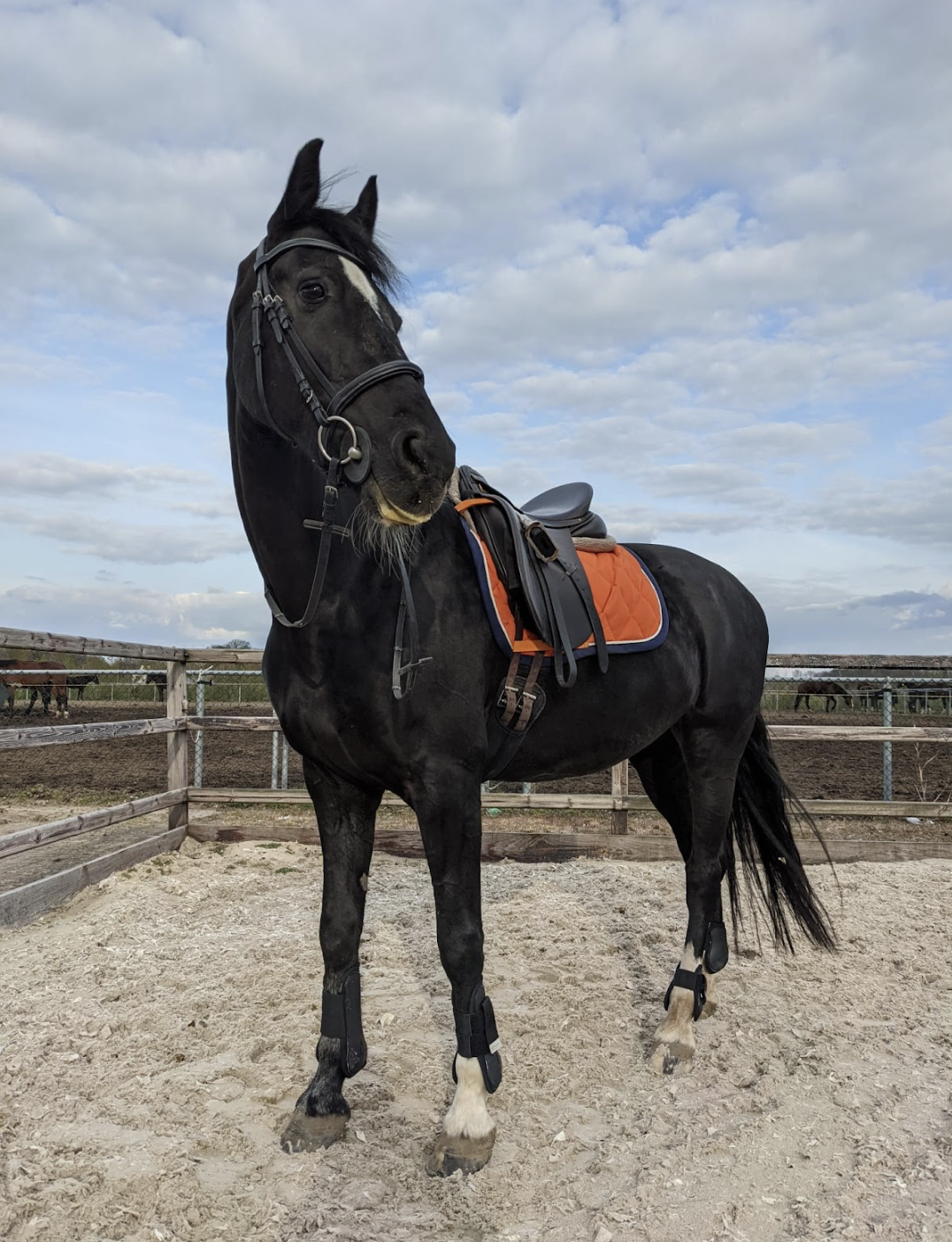 Diandra is een grote merrie die af en toe niet precies weet dat ze zo groot is. Ze is erg lief en relaxed. Een beginner loopt zo met haar weg, maar onder het zadel kan het nog wel eens hard werken zijn. Een schiktraining op zijn tijd vindt ze ook erg leuk. Helaas hebben wij Diandra in januari 2025 moeten laten gaan.